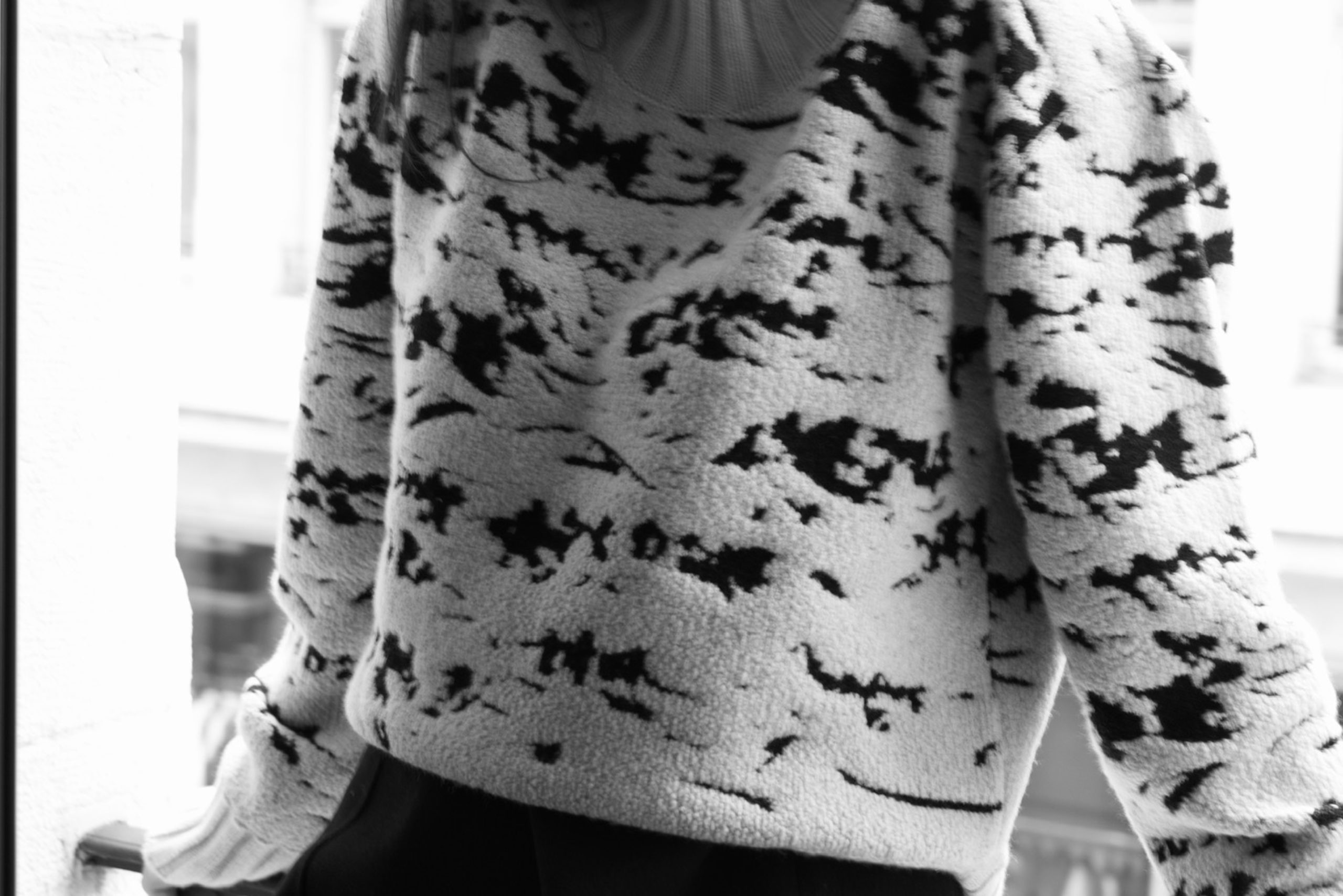 Pour un look simple et intemporel, le choix du noir et blanc est un sans-faute. Le style est sobre et élégant. Dana aime apporter une touche d'originalité à sa tenue, que cela soit par un détail imprimé tel le motif de notre pull Frauenschuh ou un accessoire coloré. Le conseil de notre interviewée "La simplicité de pièces intemporelles rehaussées par un accessoire."